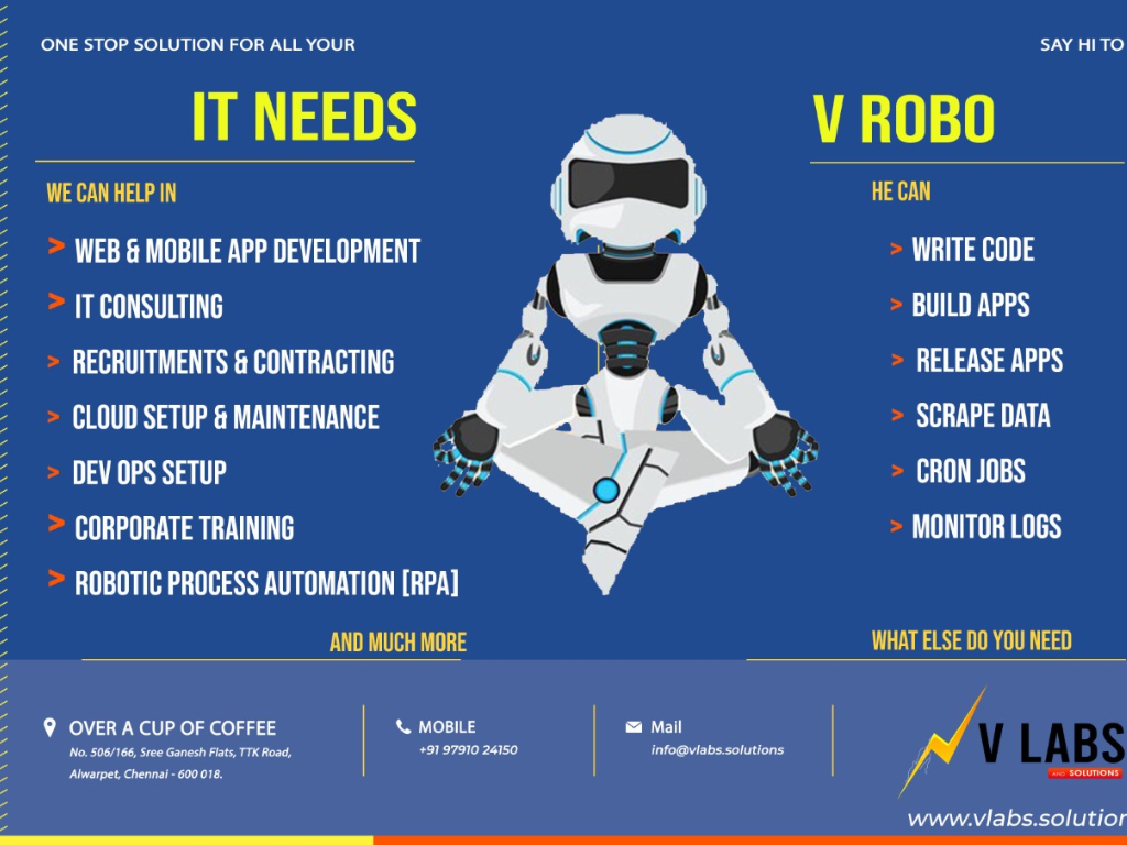 V Robo revolves around RPA (Robotic Process Automation) in IT areas where it can remove human intervention completely and automate all processes that can be automated.